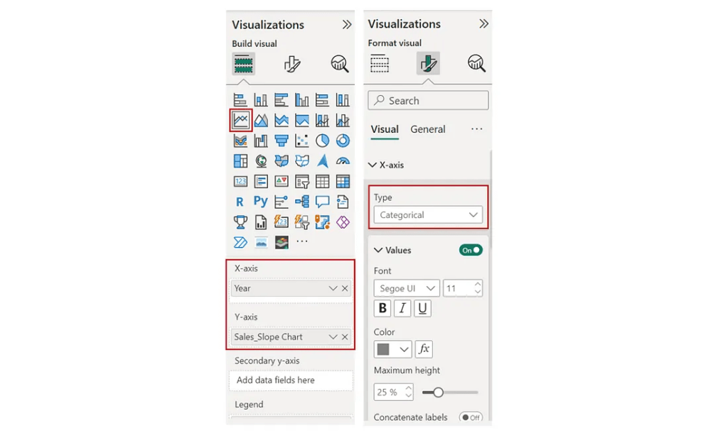 After creating the DAX measure, create a line chart. Set the x-axis to DimDate[Year] (formatted as categorical) and the y-axis to the Sales_Slope Graph measure. This will display the values for the first and last years, highlighting the change over time.